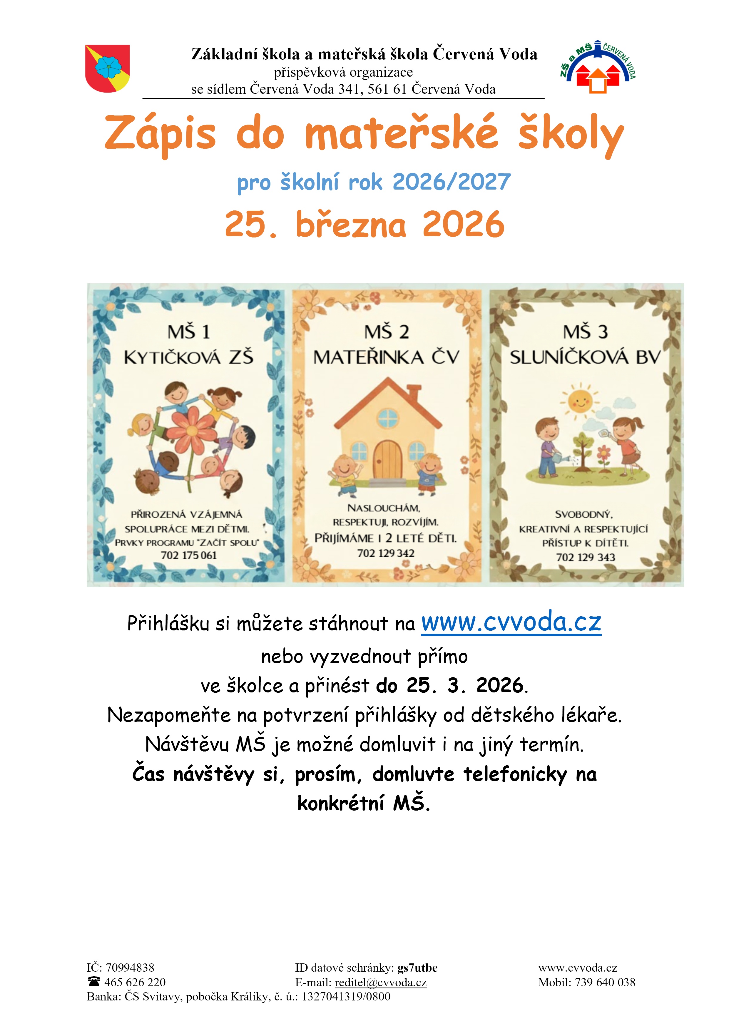 Zápis do MŠ 2026 ZŠ Červená Voda › Archiv novinek › Zápis do MŠ 2026 9. března 2026 Mateřské školy Soubory ke staženízadost-o-prijeti-k-predskolnimu-vzdelavani.pdfstáhnout